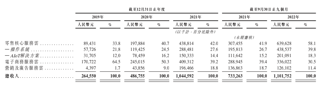 2022年上半年,零售核心服务云收入6.4亿,同比增长108.0%,在总收入中占比58.1%。其中,操作系统收入4.4亿,同比增长114.0%,占比39.8%。