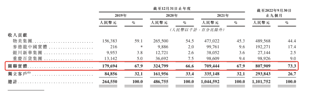 不过,需要注意的是,多点超四成收入都直接来自于物美。2019年至2022年前9个月,多点来自物美集团的收入分别为1.6亿、2.7亿、4.7亿、4.9亿,收入占比分别为59.1%、54.5%、45.3%、44.4%。