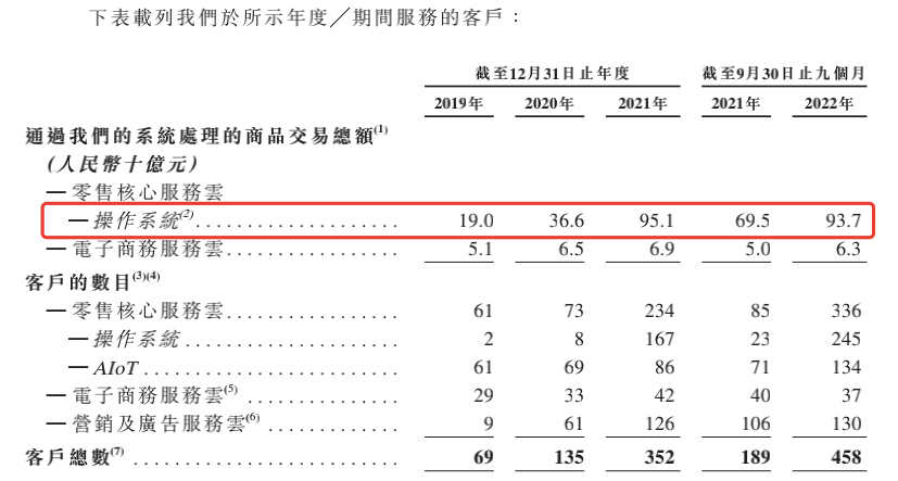 多点Dmall的核心逻辑是做一套零售数字化SaaS操作系统,根据招股书,公司提供的服务包括零售核心服务云、电子商务服务云以及营销及广告服务云。截至2022年9月末,多点客户总数为458个,其中操作系统的客户数为245个。