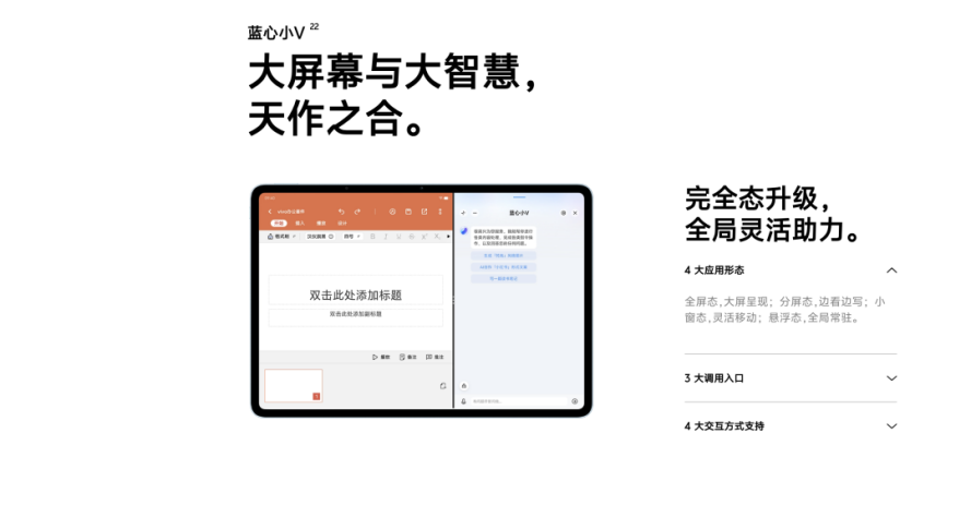 我们知道,AI要真正进入日常生活,需要一个载体或者入口,“端”——PC,手机,平板,都是端的载体。vivo在自身业务范围内,基本做到了全覆盖,上半年新发布的vivo Pad3 Pro,同样能使用蓝心小V。在这种大屏设备上,因为应用更方便,AI转化为生产力的前景也更大。但vivo同时也保持着对旧有存量产品的支持,尽可能把AI能力融入到现有的产品体系中。