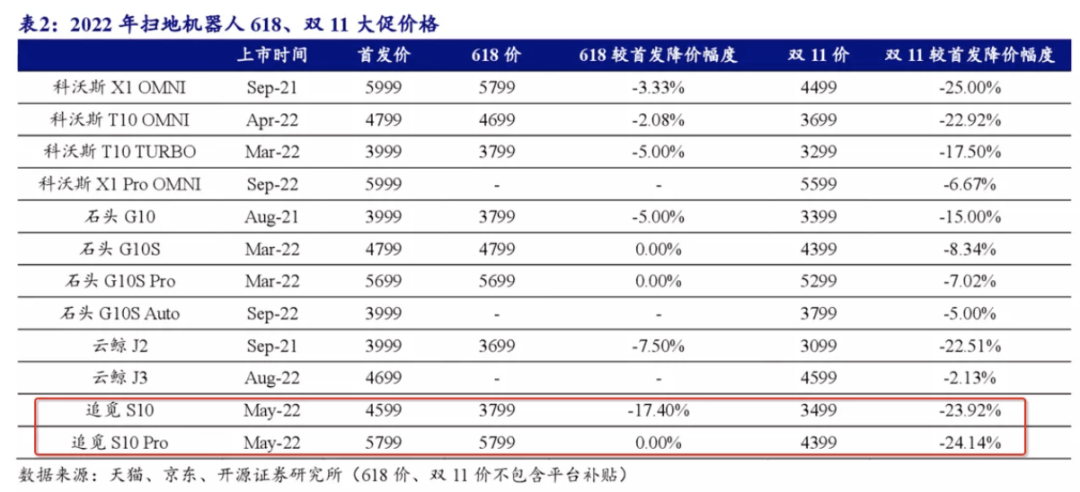 2021下半年开始,国内扫地机行业销量开始出现连续负增长,在连续多月产品均价提升及销量同比持续下滑的背景下,2022下半年开始头部企业纷纷将核心产品降价,以期提振行业稳住份额。其中追觅的降价幅度相对较大,石头降价幅度较低,但石头主要通过推出新款性价比产品,如 G1O Plus、G1OSAUTO 来实现变相降价,而追觅则是直接跳水。