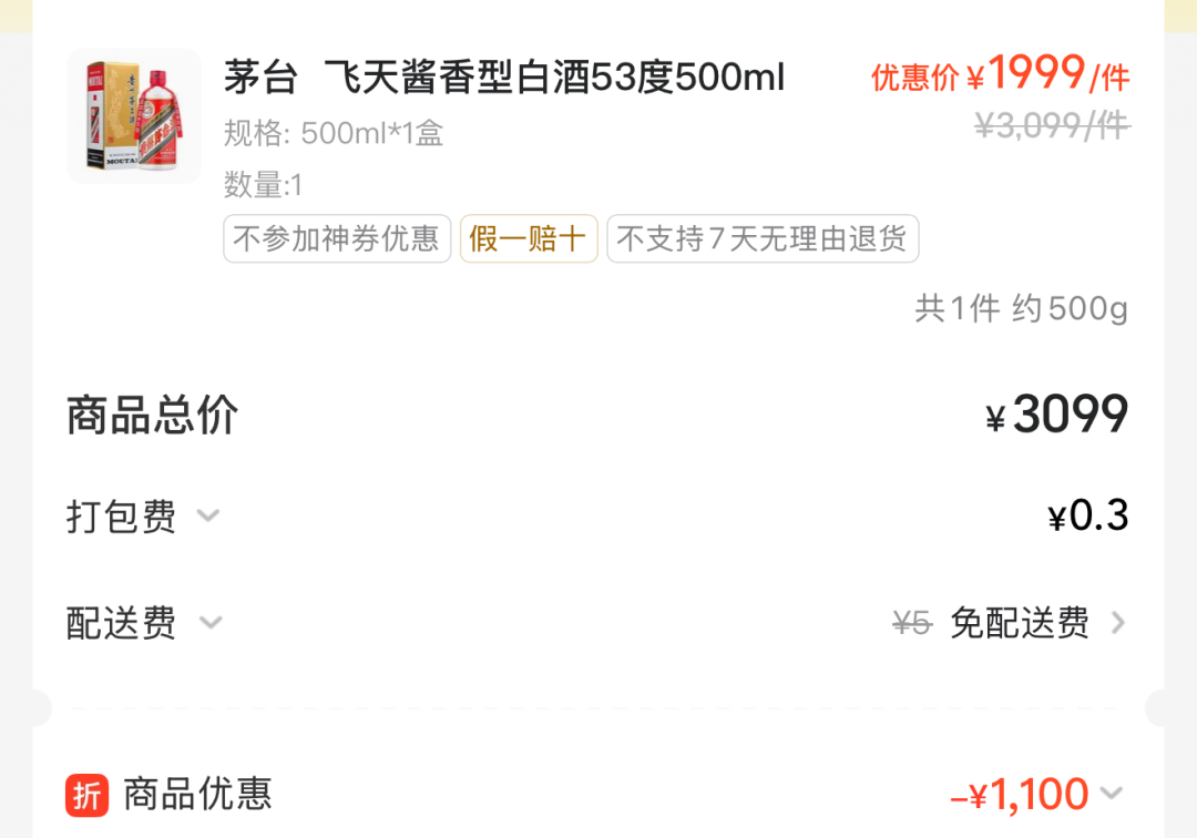 此外,在拼多多,部分店铺飞天茅台的售价已经低于2000元/瓶,而为了打消消费者对于产品真伪的疑虑,这些店铺还给出了“假一赔十”的承诺。