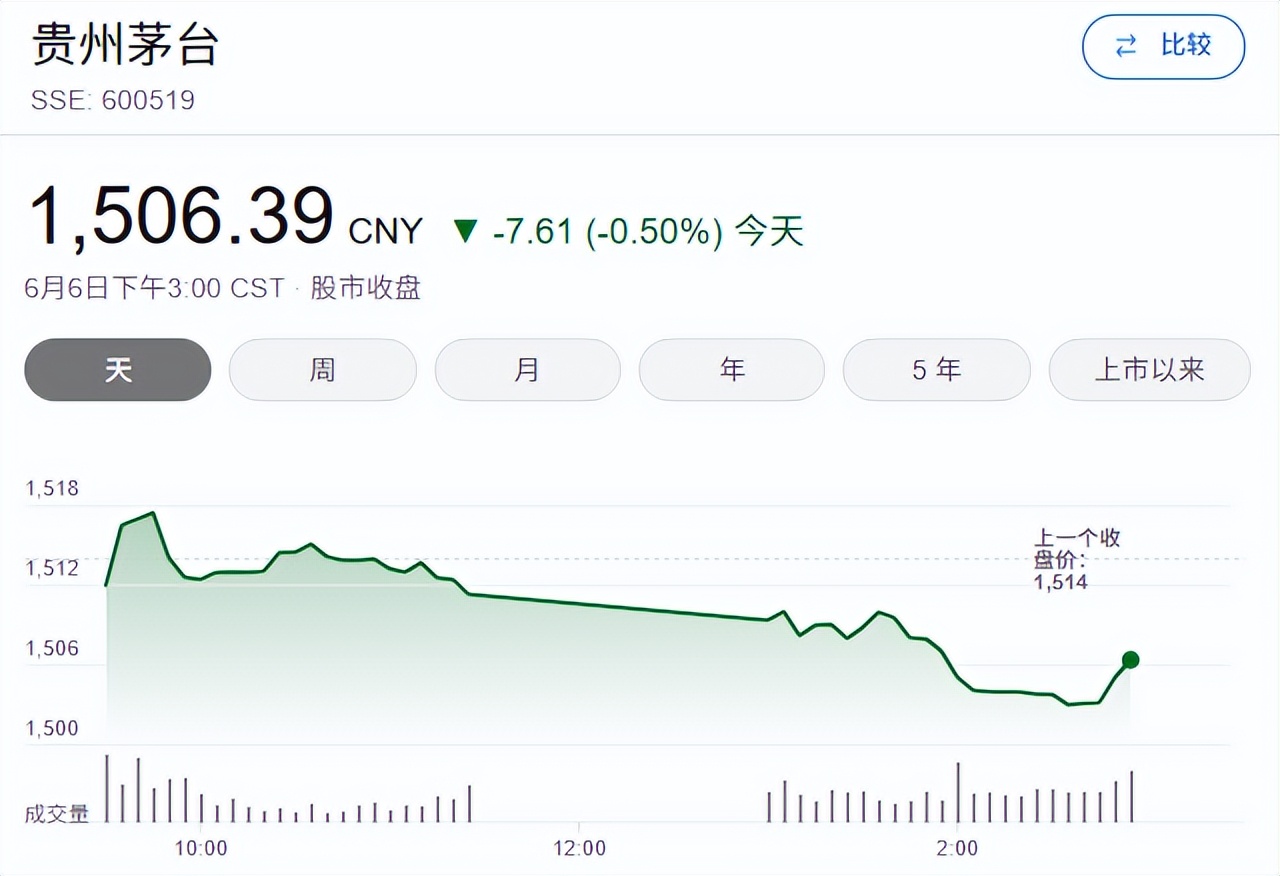 截至6月6日收盘,贵州茅台报1506.39元/股,下跌0.5%。今年以来,其股价下跌了1.16%,几近原地踏步。