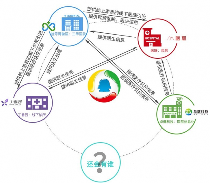 现在回过头来看腾讯的布局,挂号网代表着线上看病的场景、丁香园代表着医生学术交流的场景、医联代表着医生社交的场景、卓健代表着医院互联网化的场景。