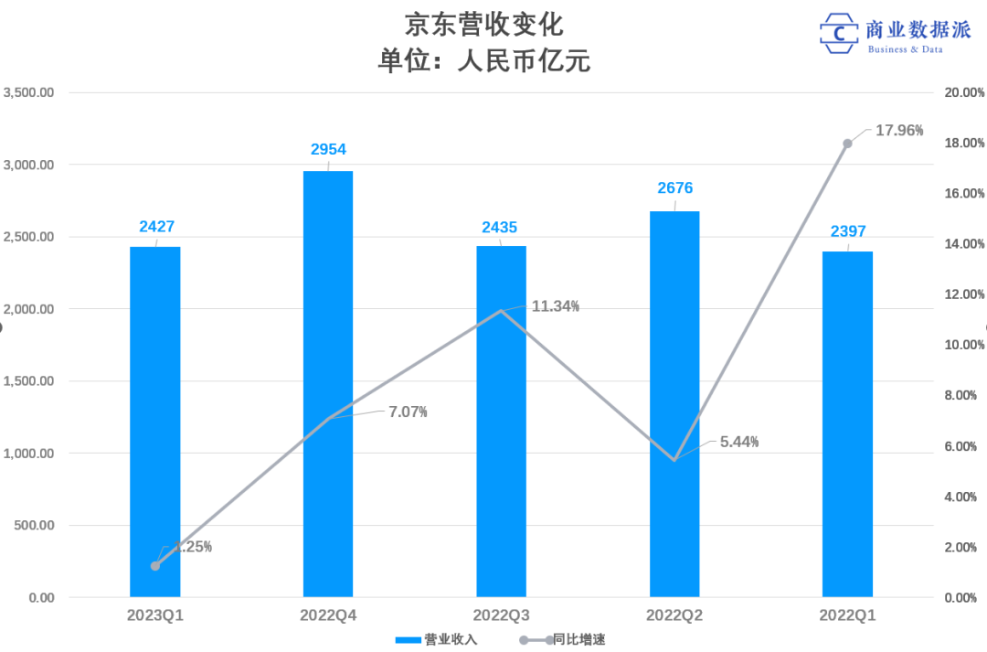 在百亿补贴的首个季度,京东在2023年一季报总体表现为收入少了,利润多了。财报显示,京东集团营收为2430亿元,较2022年第一季度增加1.4%;对应经营利润为64亿元,比2022年同期的24亿元,实现了大幅增长。收入表现整体高于市场预期,但整体趋势上看,京东的营收增速在不断放缓。