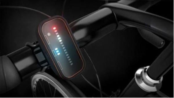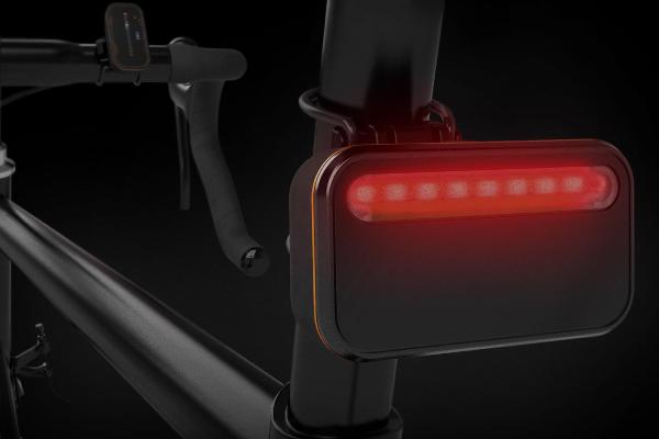 这款Backtracker自行车雷达分为两个部分,主雷达安装在自行车车座下方,方向朝后,内部安装有24Ghz雷达天线和蓝牙通信模块,同时还配备有一个40流明的红色LED灯,兼做尾灯使用。当有车辆从后方接近,进入到雷达侦测范围140米的时候,它会通过蓝牙于安装在扶手位置的led指示器上,通过指示器上的一排LED指示灯显示出来。车辆距离越近,显示器的指示灯也会提高显示级别。
