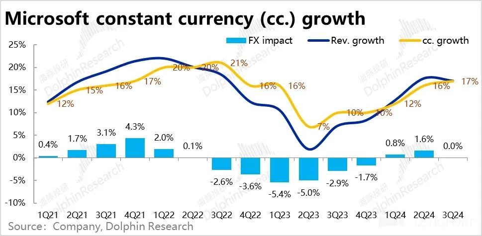 整体来看,微软本季实现营收 619 亿美元,名义增速从上季的 18% 略微放缓到 17%。但恒定汇率下增速为 17%,较上季是提速了 1pct。