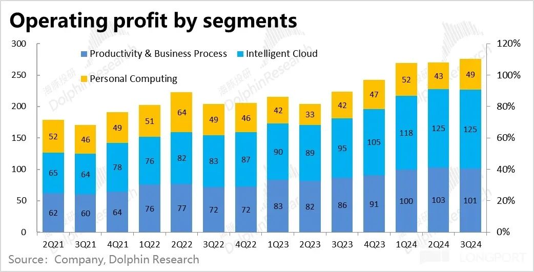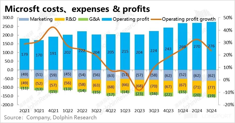 3)所以在营收超预期,而费用支出却贴着指引下限的情况下,最终微软本季的经营利润达到了 276 亿美元,比预期高出 14 亿。同比增长 23% 继续领先营收增速。