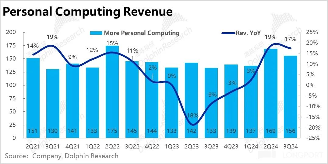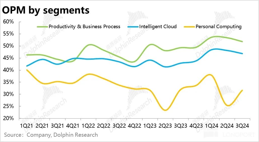 但抛开预期差,从业绩趋势上, 1)Windows OEM 业务收入同比增长了 11%,在上季度的 9% 的水平上继续走高。虽有去年低基数的影响,但后续随着 “AI PC” 若真能有较大的升级,个人 PC 也可能迎来一波可观的更新周期;