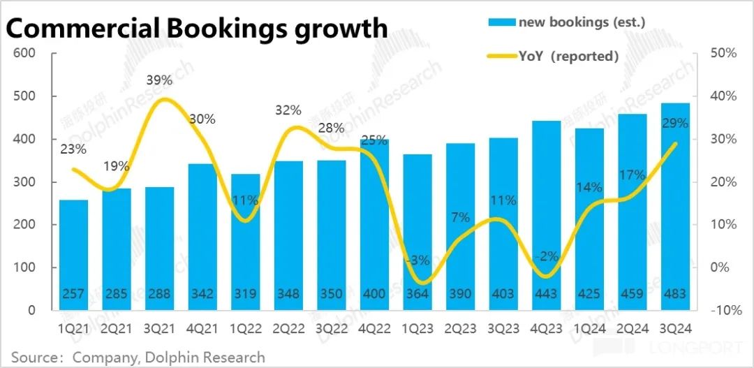 由上可见,本季微软最大的亮点就在于 Azure 在 AI 需求的驱动下,营收超预期提速。而反映当季需求增量的新签企业云业务合同金额,据公司披露增速从 17% 大幅拉升到了 29%。如此大幅的拉升,似乎同样验证了可观的 AI 云计算需求还有待释放,以及优化周期已经结束,企业正重新加大投入,且 “来势迅猛”。