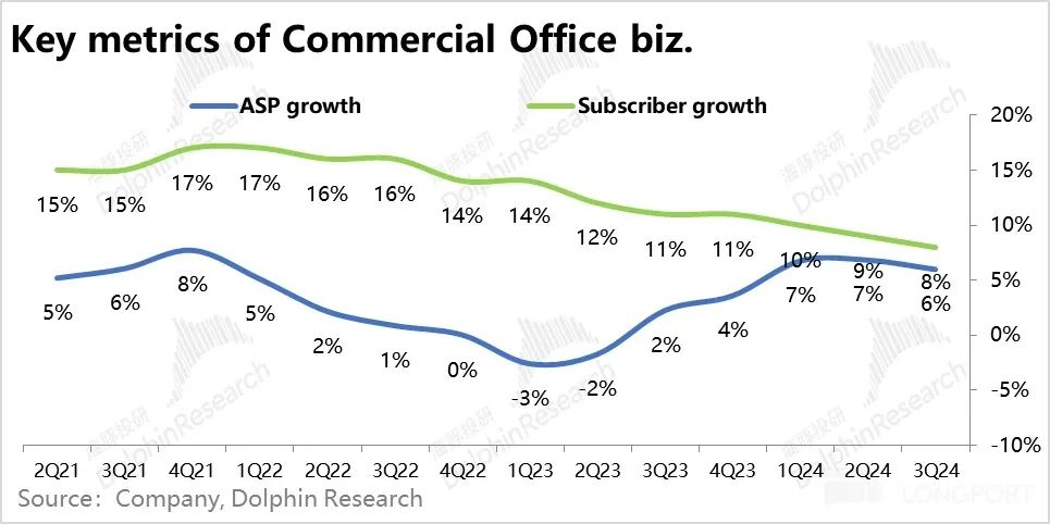从量价角度拆分来看:1)本季企业 Office 365 订阅客户数同比增长了 8% 延续了 2022 年以来持续缓慢下行的趋势。由于量的层面,Office 在中大企业的渗透率已趋于饱和,增长越发放缓符合常理,后续需要在中小企业的渗透率有明显提高,或许才能迎来增长的拐点。