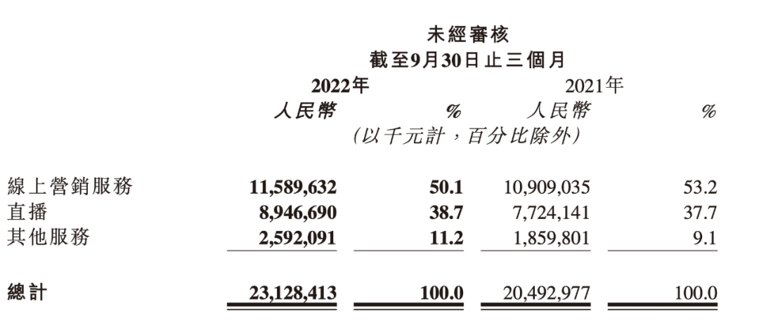 三季度的线上营销服务收入达116亿元,同比增长6.2%。三季度的月活跃广告主数量同比增长超65%。该增长得益于平台电商业务的规模扩张,借助平台流量和闭环生态的转化效率优势,向电商商家提供的广告服务保持了健康的涨势。通过引导直播电商广告客户在短视频投流消耗,同时鼓励短视频广告主参与直播,推动广告主利用「短视频+直播」,抓住广告主其他营销需求增长的机会。