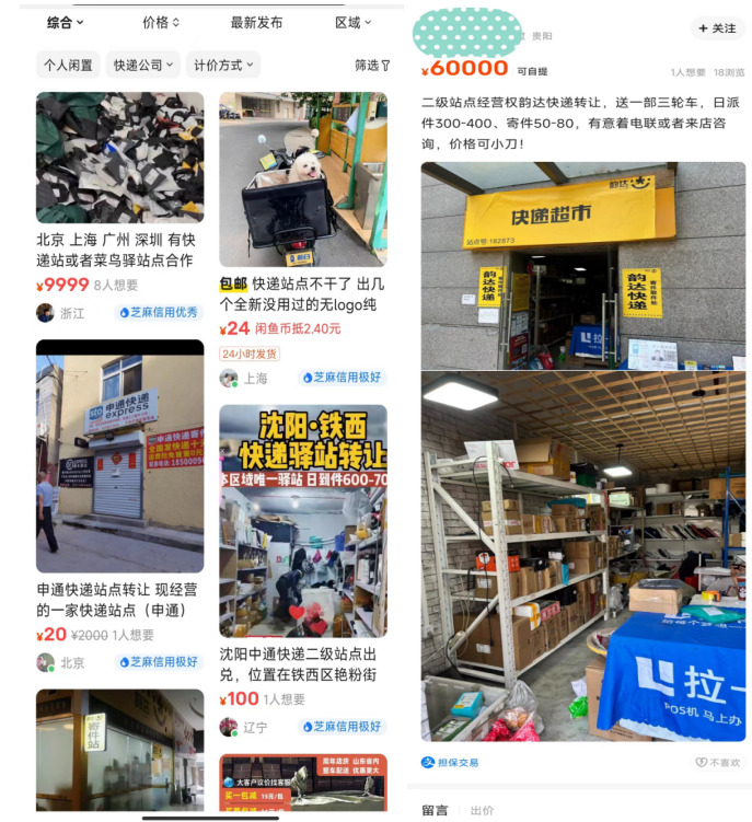 浏览二手交易平台闲鱼,有多条快递站点转让信息。订单涉及申通、中通、韵达、极兔等。
