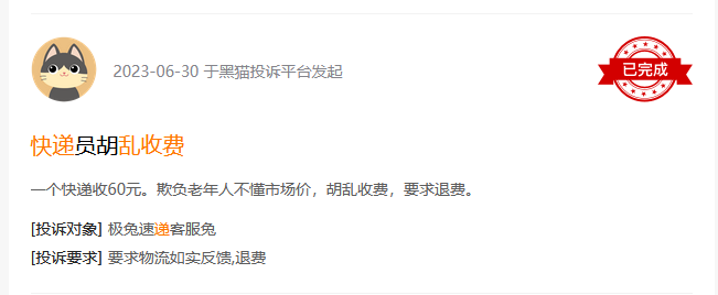 6月30日,有用户投诉极兔快递员乱收费。称一个快递收60元,欺负老年人不懂市场价,胡乱收费,要求退费。