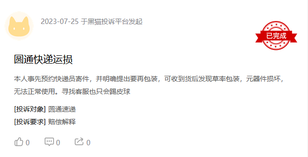 如7月25日,有消费者在黑猫投诉平台投诉圆通快递,称事先预约快递员寄件,并明确提出要求再包装,可收到货后发现包装草率,元器件损坏,无法正常使用。寻找客服也只会踢皮球。