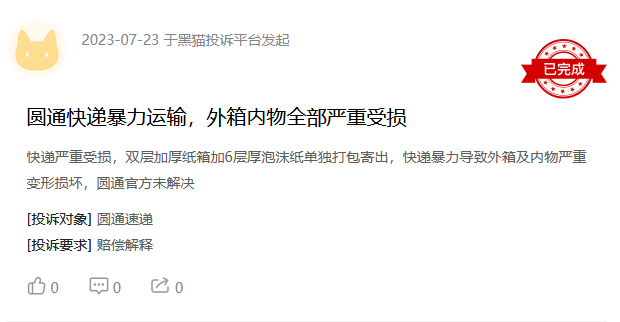 无独有偶,7月23日,同样有消费者投诉圆通承运的物品损坏。其称用双层加厚纸箱加6层厚泡沫纸单独打包寄出,但暴力运输仍导致外箱及内物严重变形损坏。