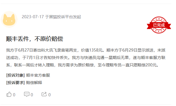 如7月17日,有用户投诉顺丰速递丢件,且不按原价赔偿。其于6月27日寄出科大讯飞录音笔两支,价值1358元。6月29日,顺丰显示派送,但7月1日却被告知丢件。消费者与快递员沟通一星期后仍无结果,后跟顺丰客服联系一周后才进入理赔流程。该消费者希望原价赔偿,理赔专员则表示只愿赔200元。