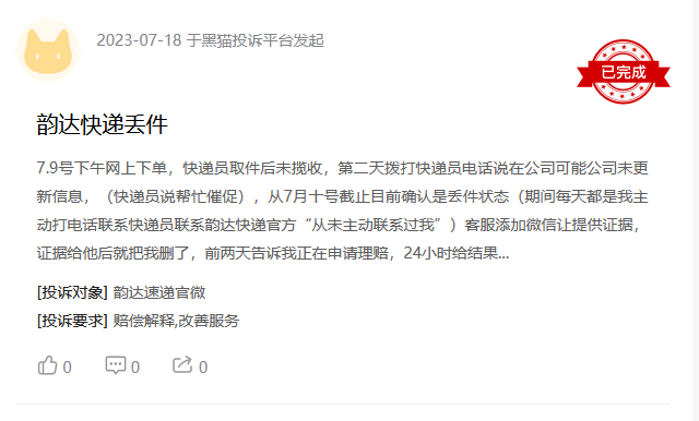 7月18日,一用户投诉韵达快递丢件。其于7月9日下午下单,但快递员取件后并未揽收,从7月10日起该快递状态被确认为丢件……