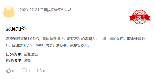 如7月24日,有用户投诉圆通恶意谎报快递重量1.04KG。寄出货物是退货,原封不动地寄回去,顺丰计费1KG,圆通却计费1.04KG。