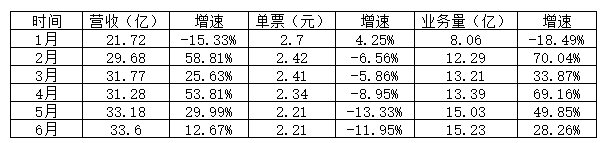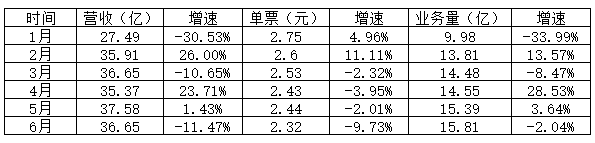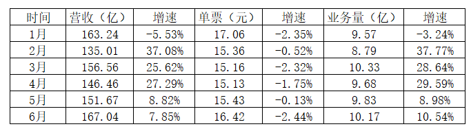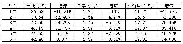 而单票收入,则呈下滑趋势,如1月为17.06元,6月份变成16.42元。