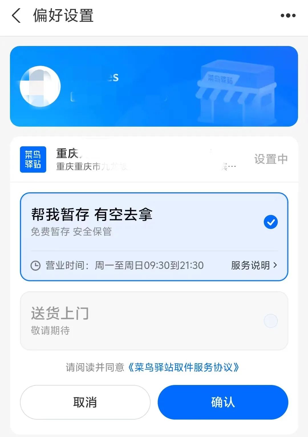“极点商业”所在小区菜鸟驿站同样未开通该服务,从用户端来看,在菜鸟“收货偏好设置”里,无从选择“送货上门”选项,而是自动被选择“帮我暂存,有空去拿”——所有快递,也就会被自动放入菜鸟驿站中。