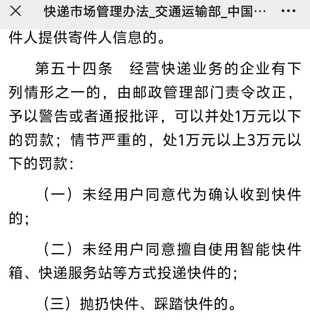 为解决快递员、驿站和消费者之间这一核心矛盾,3月1日,交通运输部《快递市场管理办法》正式施行。《办法》明确规定,快递企业如有未经用户同意擅自使用智能快件箱、快递服务站等方式投递快件等情形,最高将被处罚3万元。