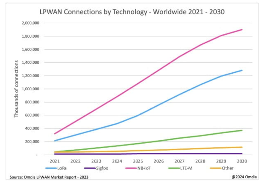 今年6月,市场研究机构发布报告显示,低功耗广域网 (LPWAN) 连接领域以 NB-IoT 和 LoRa 为主导,2023 年这两种技术合计占总连接的 87%。这种主导地位将持续下去,预计到 2030 年,这两种技术将占据所有 LPWAN 连接的 86%。