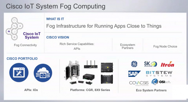 思科推出的物联网里涵括大量的基础设施设备(从网络设备到安全摄像机不等)。思科同时还加入了分析工具、应用管理以及所谓的“雾计算”(Fog computing)。