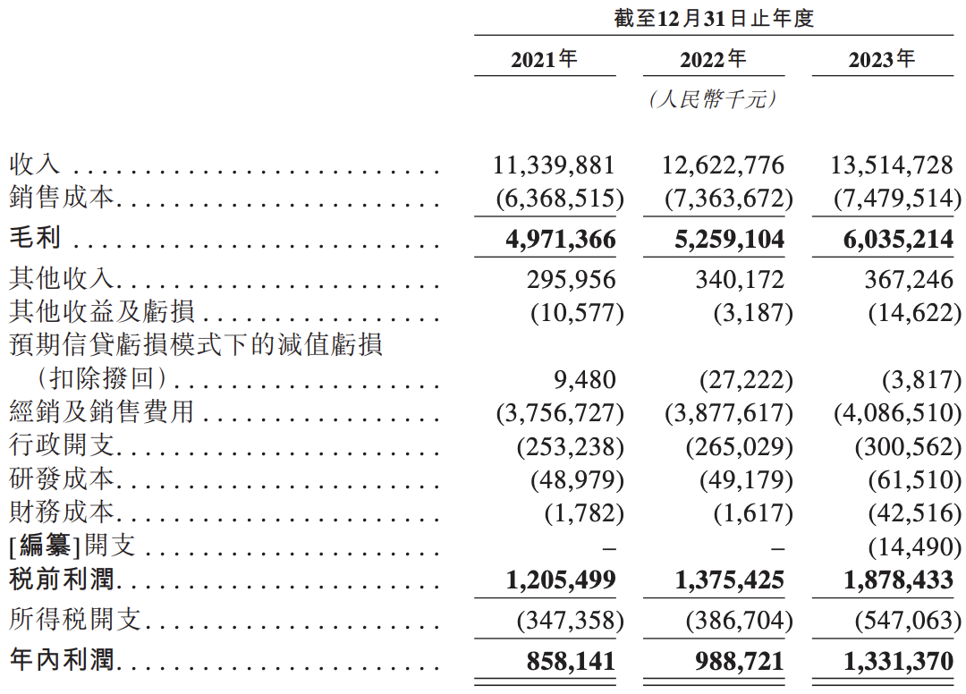 2021年、2022年和2023年度,华润饮料的收入分别约为人民币113.40亿元、126.23亿元和135.15亿元,毛利分别为49.71亿元、52.59亿元和60.35亿元,净利润分别约为8.58亿元、9.89亿元和13.31亿元。