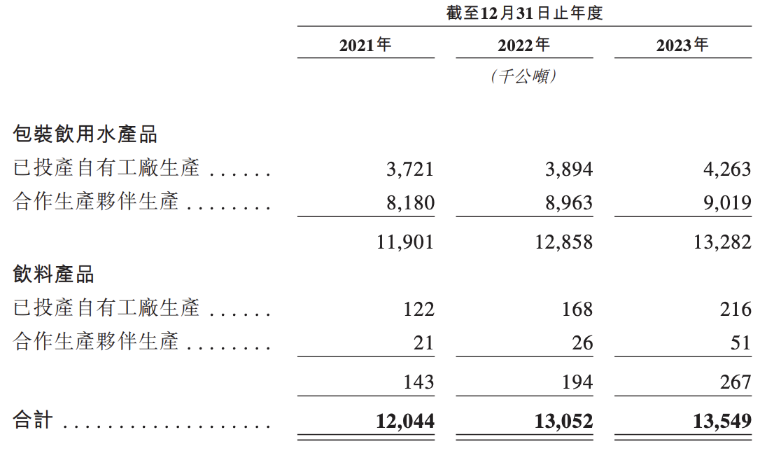 2023年,华润饮料包装饮用水及饮料产品2023年的实际年总产量约为1350万公吨。据此计算,该公司的产能利用率约为71.81%。据招股书披露,该公司2023年的自有产量约440万吨,较2021年增加16.5%。