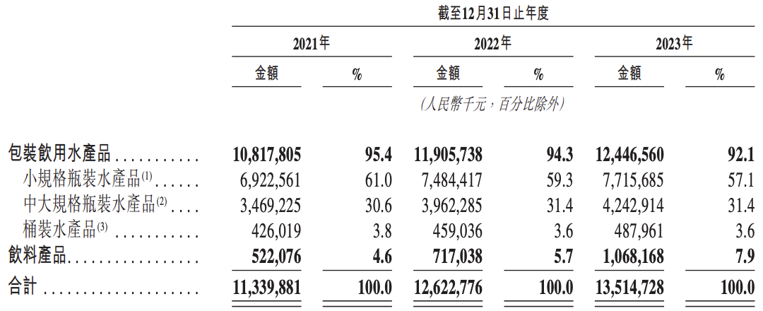 另据招股书披露,华润饮料的多数收入由包装饮用水产品贡献,而饮料产品的占比不足10%。具体来看,华润饮料2021年、2022年和2023年的包装饮用水产品收入分别约为108.18亿元、119.06亿元和124.47亿元,占比分别为95.4%、94.3%和92.1%。