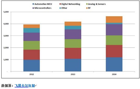 此外,飞思卡尔的投资也毫不手软,这三年来花在投资上的金额也高过7亿美元。这也是为什么飞思卡尔的营收能够连续三年成长,而占比最高的车用电子(Automotive MCU)部分,在2014年成长了将近10%(见图1)。