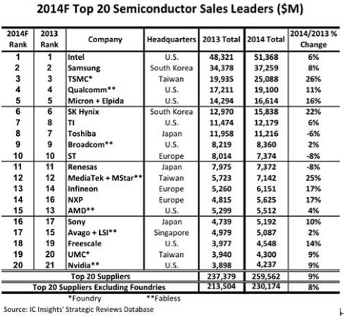 这桩交易也改写了全球半导体业的竞争版图。如前所述,合并完成后的新恩智浦将因为营收规模扩增,挤进全球前十大半导体厂商之列;其实,如果把专注代工的台积电、以内存为主力产品的美光(Micron)和SK海力士(SK Hynix)忽略不计,新恩智浦已经具备挑战前五大的实力。再加上不管恩智浦或者飞思卡尔,在2014年都有两位数的营收成长率。