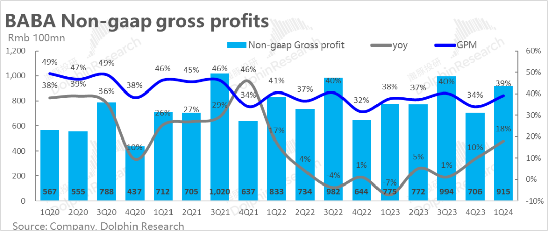 而从财务数据角度来看,本季度阿里non-gaap口径下的毛利率达39%,较去年同期只是小幅提升了1pct。可见利润的提升主要来源于控费和剔除非优质资产。