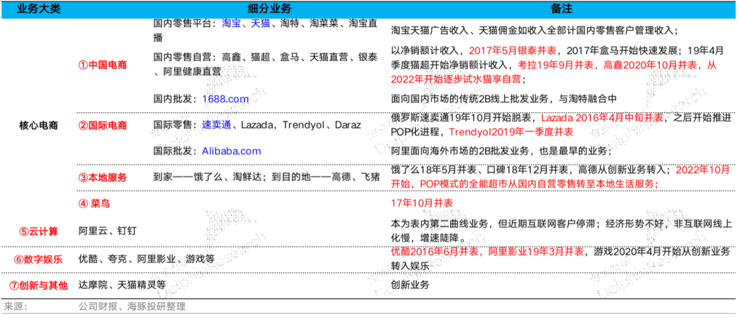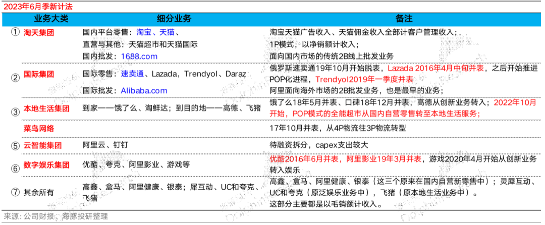 2)国际集团:基本对应之前的速卖通、Lazada等国际零售和阿里国际站业务3)本地生活集团:饿了么和高德4)菜鸟集团:与原来一样,只是现在收入计法把阿里集团内其他业务当做客户,产生的收入计入到了菜鸟公司收入中;