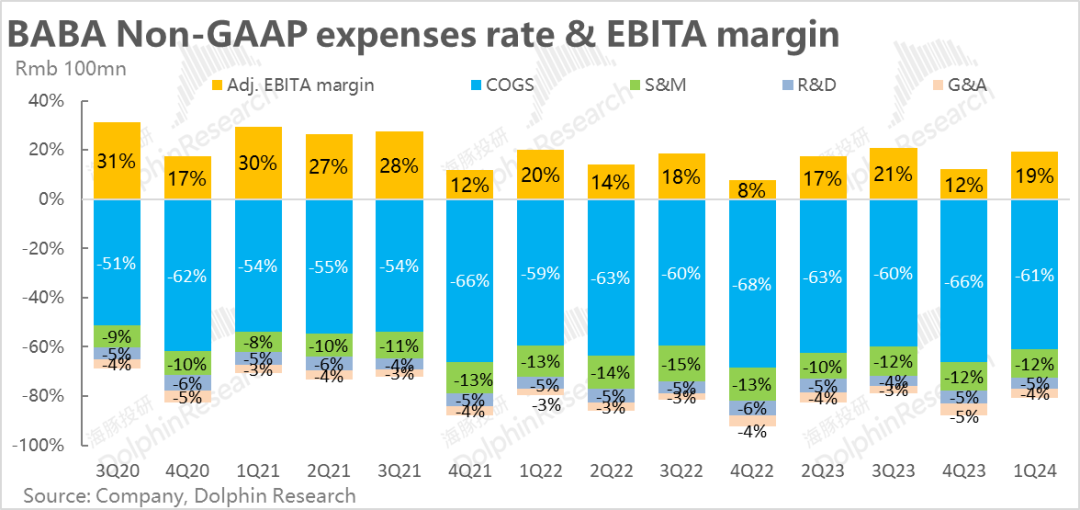 因此,公司本季度整体的non-gaap净利润率相比去年同期提升幅度约4pct,相比上季度3pct的改善幅度也并没有非常明显的提升。(主要还是因为比重最高的淘天板块利润率是下降的,导致其他板块的改善在集团整体层面并不显著。)