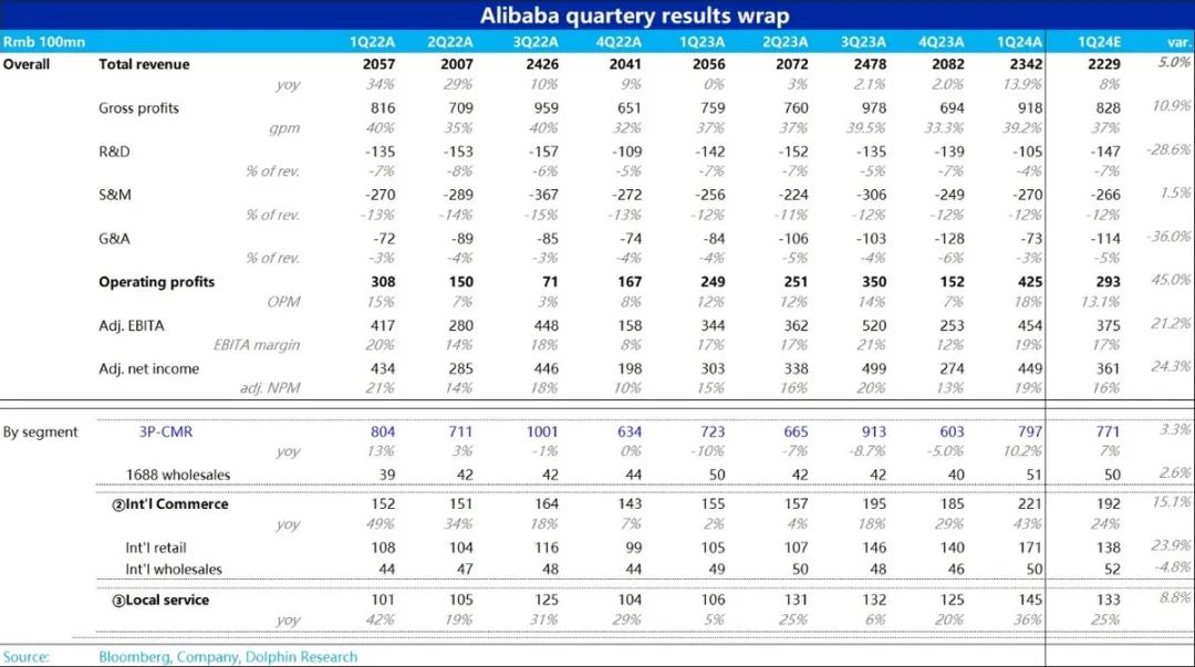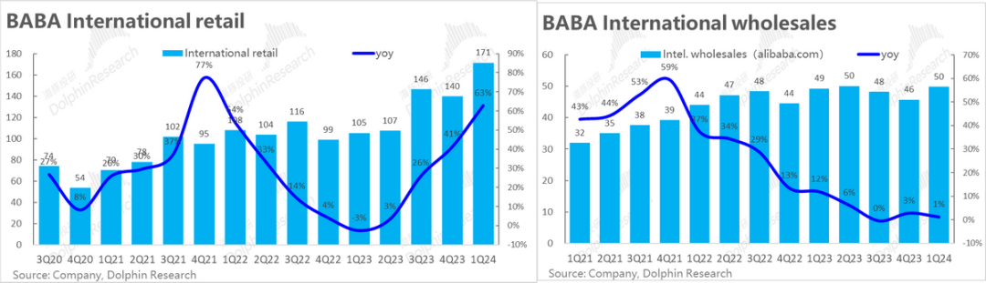 且国际业务的口径调整不大,仍可参考对比历史数据。本季包括Lazada、Aliexpress、Trendyol等海外零售业务实现了惊人的超60%的增速,远超市场普遍预期30%-40%的增长。虽然国际批发业务基本零增长,但加总后,国际电商板块仍实现了41%的增长和221亿的收入。