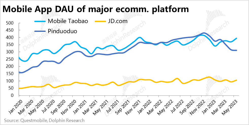 但从前端流量和用户数来看,根据Quest Mobile 淘宝App的日活用户自2023年初以来一直在持续增长,公司口径下,淘天集团本季度内日活用户同比增长了6.5%。可以看出,随着以用户流量为先的战略方向和“天天低价”、“百亿补贴”、“夜淘宝”、“逛逛短视频”等多项举措的实施,阿里的用户流量和粘性确实正在回归,明确打响了反击拼多多和抖音流量侵蚀的第一步。值得关注后续各平台对用户流量的争夺情况。
