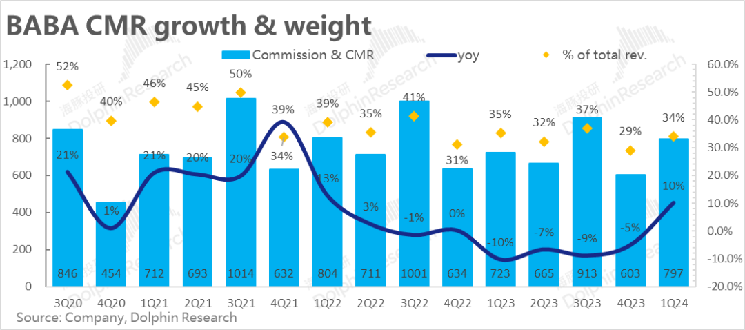 并且本季度极低基数的利好并不能持续,市场因此也普遍预期后续CMR增速大概率会再度下滑。因此概括地说,淘宝天猫本季在增长端的表现主要是低基数下的略超预期,淘天实际的竞争格局和增长中枢的拐点大概率尚未正式到来。