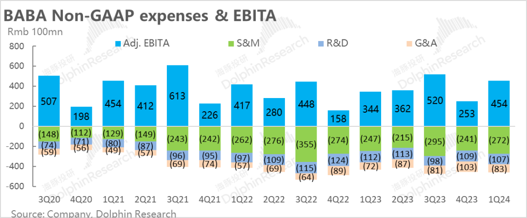 1) 淘天集团本季调整后的摊销前经营利润(EBITA)实际同比只增长了9%,反而低于营收10%的增长,可见淘宝天猫的利润率的确还是略微受到了补贴和竞争格局的影响。后续我们也会看到,本季营销支出的确有不小的增长。