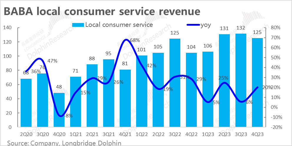 3)挺不错:菜鸟与本地生活。由于泛娱乐进步是在太猛,这两个其实表现也不错的只能排在第三了。a. 菜鸟主要依附国际业务,其次依附淘天中的自营业务,直营增速21%;国际业务订单增速25%,菜鸟做到了34%,只能说明菜鸟在外部客户拓展上做得也不错。b. 本地生活同比增速做到了30%,当然这里面有一部分原因去年基数太低了,但收入同比和利润率同时修复表现也算不错。
