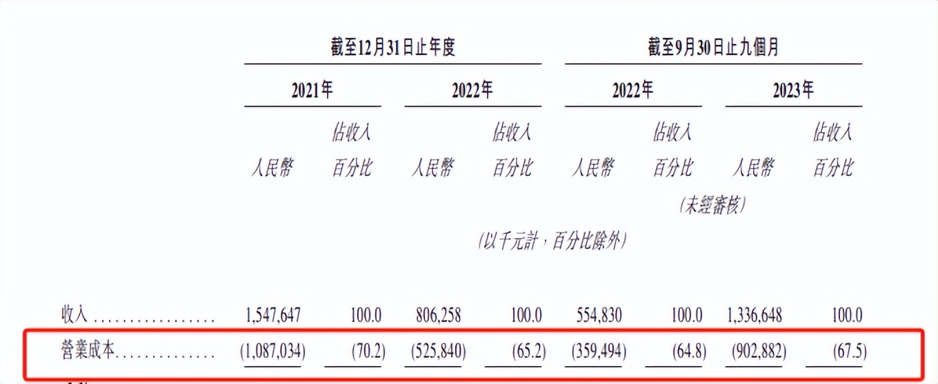 争夺全生命周期价值高的客户,不断促成保险保单的背后,是手回科技较高的品牌广告、流量渠道等开支。根据招股书,2021年、2022年以及2023前三季度,手回科技营业成本分别占了营业收入的70.2%、65.2%、67.5%。
