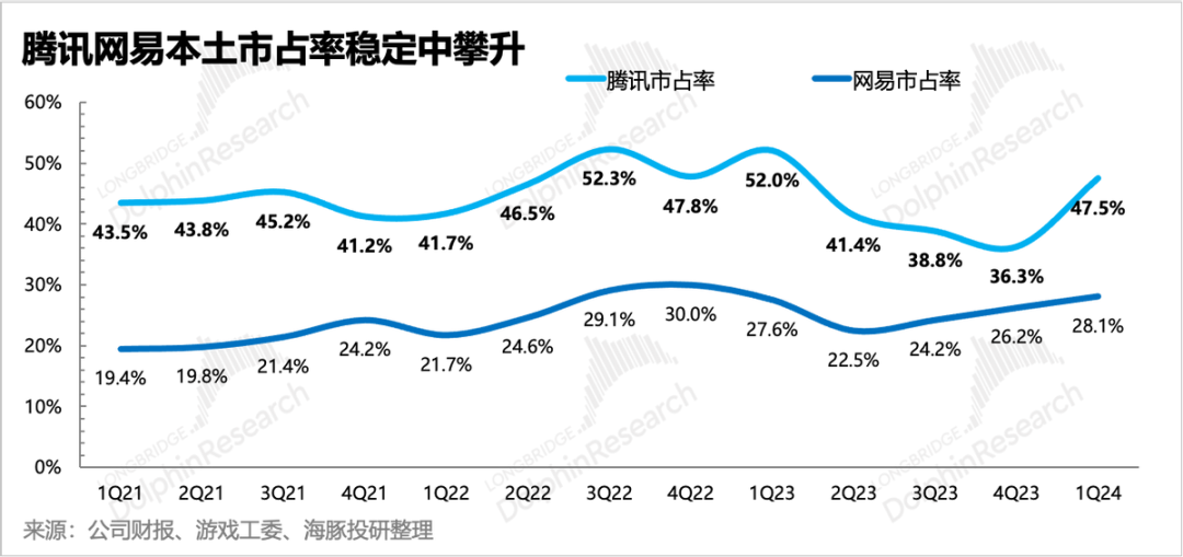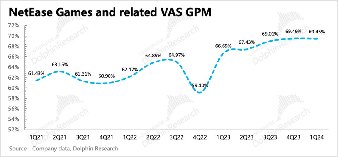 但内容定位的目标用户偏垂类的游戏,比如《全明星街球派对》,网易就会去尝试完全舍弃传统安卓渠道,而选择新的纯买量获客方式——在抖音、快手、b站上买量,然后引导用户下载官服安装包。另外,对于玩家相对固定,经营多年的常青游戏,比如《梦幻西游手游》,则可以通过私域运营/新兴渠道买量,来引导用户至官网下载安装包,就可以避开传统渠道的50%抽成。网易这种主动性的渠道变革,在22年前后开始大量推进,带给网易这几年最大的受益就是游戏毛利率持续上升,目前1Q24游戏及相关增值已经达到了69.5%,如果剔除低毛利率的直播CC等相关增值业务,纯游戏毛利率应该已经70%以上。