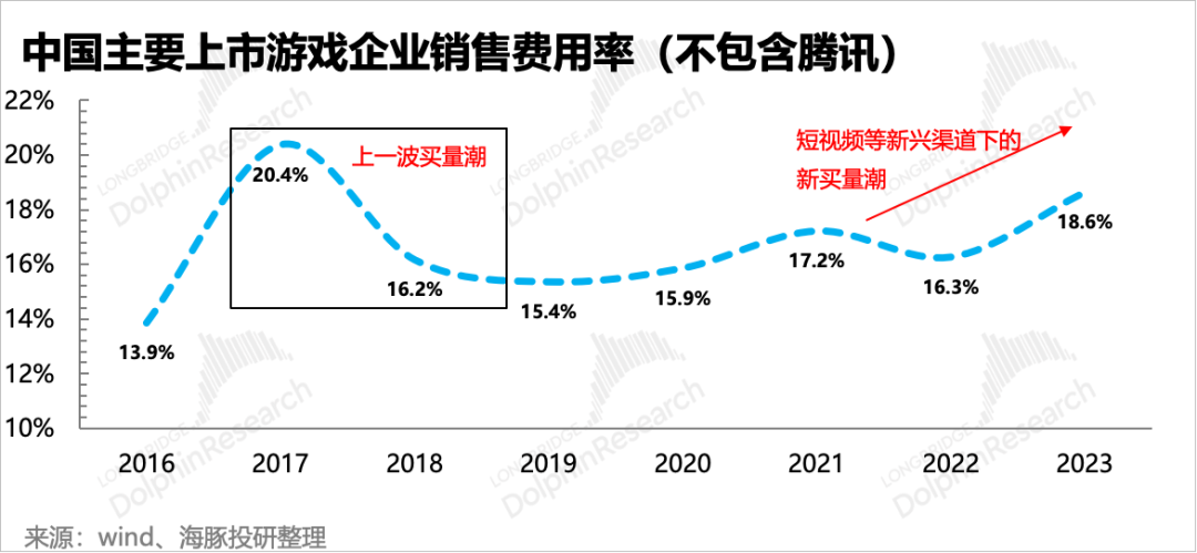 如果腾讯也选择这样的方式,假设引导《王者荣耀》、《和平精英》等运营多年、占比总游戏收入一半的老游戏,1/3流水为无渠道分成的官服带来,那么游戏业务带来的利润贡献也将有很大提升:根据第三方数据,《王者荣耀》一年流水大概450亿左右,其中iOS 40%,Android 60%。假设现在的安卓用户全部来自于应用商店渠道,如果后面安卓渠道有一半转为零抽成的官服,那么意味着王者的毛利润直接提高450*(60%*50%)*50%=60多亿,按照2023年计算,等于一款游戏的渠道变革,就将腾讯综合毛利率直接拉高了1pct。(当然实际没这么高,因为腾讯除了官服,本身也有微信游戏、应用宝等渠道)不过值得一提的是,新游尝试买量获客的方式,也使得网易的买量支出也在走高。不过始终为流量净流入的新兴渠道(短视频抖快、B站、小红书等),在任何时候都不能缺少在其平台买量,因此渠道综合占比下降的同时,另一种方式的“游戏买量之风”卷土重来。但这一回,对于游戏厂商来说,买量并没有显著加重盈利负担。