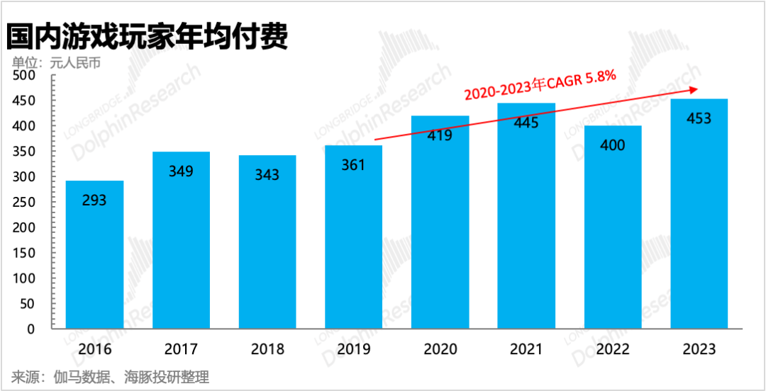 但游戏的抗周期性能够从人均付费数据变化中得以一窥。虽然2022年人均付费也出现了大幅下滑,但平衡疫情、版号停审带来的波动影响,同样看2020-2023年的CAGR,人均付费增速达到5.8%,甚至高于2019年5.4%的同比增速。