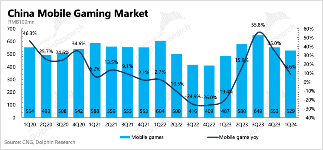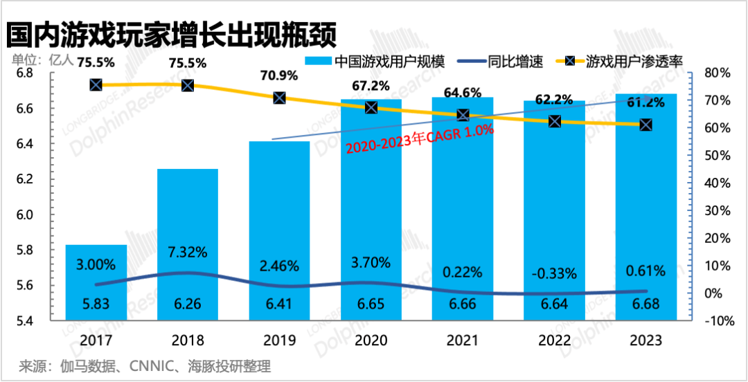 海豚君认为,手游市场的增长停滞,并非主要源于疲软的宏观经济和消费环境。历史经验表明,娱乐消费在经济压力期,反而因为能够给玩家带来轻松愉悦、释放压力的作用,行业、尤其是头部优质游戏更有可能走出抗周期性的趋势。而手游市场快速走到平台期的真正原因,我们认为,除了一贯以来行业存在的供给问题——版号总量收缩带来“优质”游戏量的稀缺,当下还面临着需求增长显著放缓的问题——互联网流量红利殆尽下,游戏用户渗透到顶的尴尬。从2021年起游戏用户就已经基本不增长了,2020-2023年,网游玩家规模年均符合增速只有1%,而2019年还有2.5%的用户规模增速。