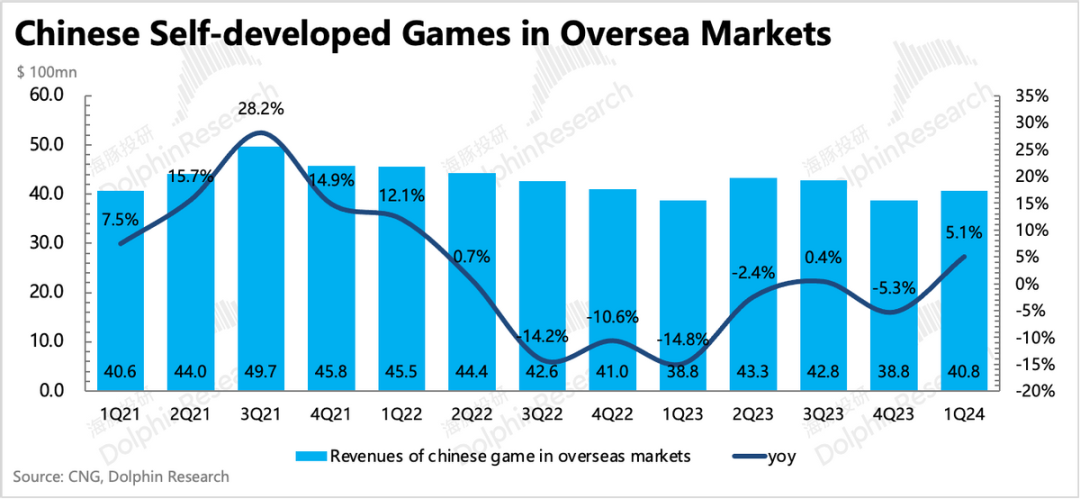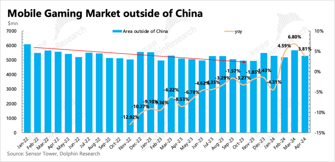 2. 增量变存量,头部撕逼才有用天下熙熙,皆为利来。无论是内容vs渠道,还是官服vs渠道服,亦或是新渠道vs老渠道,这种越发撕破脸的势头,背后还是源于逐步从增量变为存量的市场趋势。疫情红利之后,全球手游市场都陷入了增长瓶颈期。中国本土市场或许更受到版号停审的影响扰动,但中国地区以外的市场也并没有按趋势恢复自然增长。在这种总量收缩的大环境下,国内手游厂商的出海故事,在走过最容易高歌猛进了一年后,也很快在去年下半年偃旗息鼓。1Q24的增速修复至5%,纯粹是腾讯自己的alpha(Supercell的《Brawl Stars荒野乱斗》,1Q24国内游戏厂商的海外收入增速修复至5%,但这纯粹是由腾讯自己的alpha(Supercell的《Brawl Stars荒野乱斗》贡献,通过引入扭蛋运气玩法等一系列增加用户粘性、付费转化的举措,改版后月均收入相比去年6月暴增5倍)。