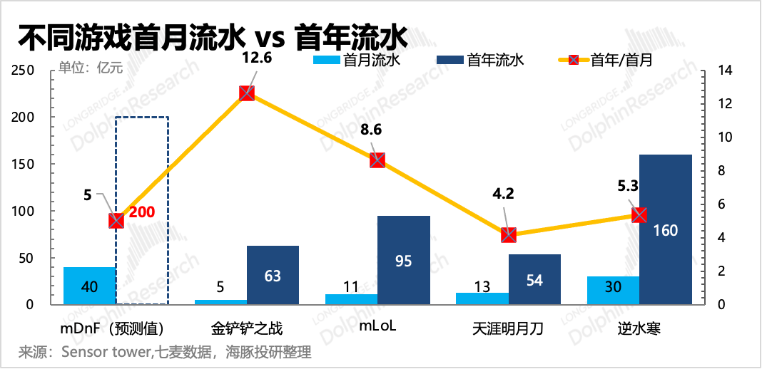 对于安卓硬核联盟来说,以往50%分成躺赚的日子太舒服,何况三年前腾讯掐架没打赢,大概率也是不撞南墙不回头。只有超级头部游戏,才能给到腾讯对抗到底的勇气。就目前来看,流水大超预期的DnF手游就是这个能够搅动池水的超级头部。那么,DnF手游到底有多爆?上线首日流水超3亿,由于近一个月来持续霸榜,市场对《DnF手游》的年度流水预期也从50-100亿快速提高到了150-200亿,更有机构直接乐观拍到了300亿。海豚君认为,后者预期存在线性外推下过于乐观的假设。