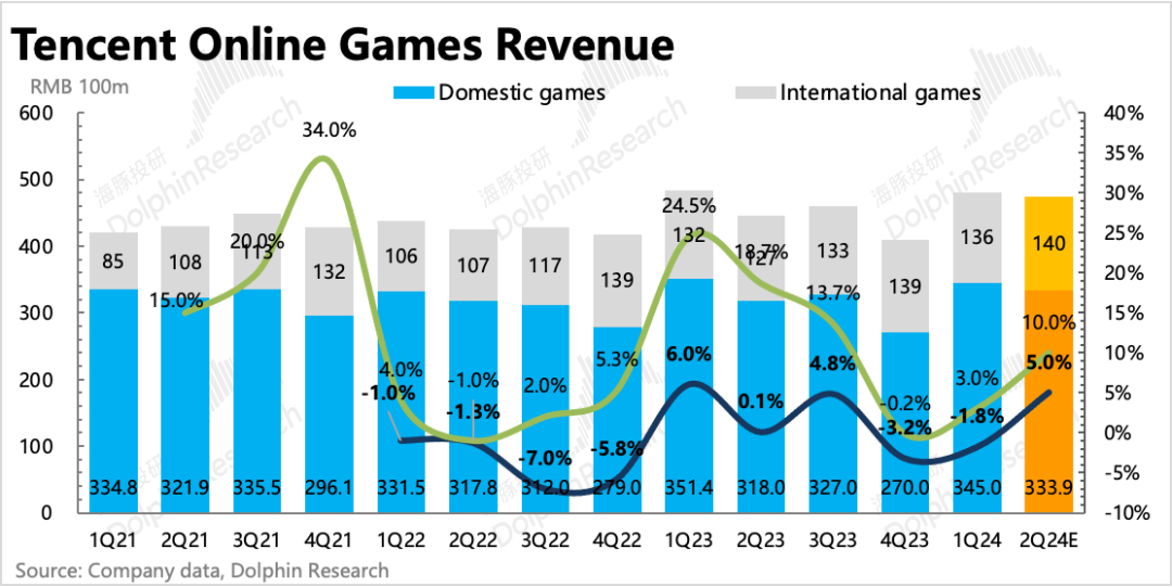 不过不可否认的是,纵使部分机构乐观高估流水,《DnF手游》还是一款已经跃至一梯队的成功游戏,也是让腾讯游戏在沉寂三年后,终于扬眉吐气、霸主回归的“救命符”——海豚君预计,今年二季度有了DnF手游的加持(假设50亿流水,按照40%当季确认兑现收入20亿),预计腾讯本土游戏收入能够恢复到同比5%的增长(其他游戏下滑2%,加上DnF带来的20亿收入净增加),即达到332亿的单季度收入。