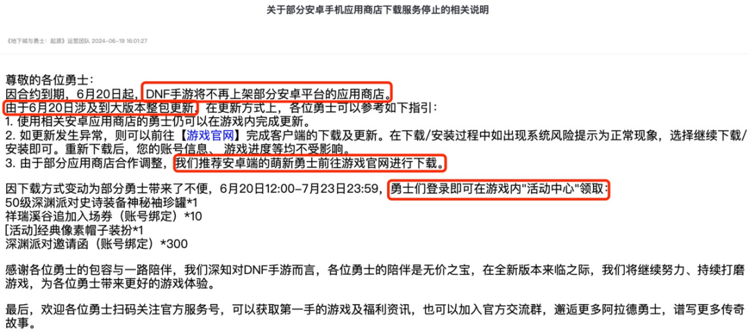 虽然DnF手游不是低氪大DAU游戏,也确实更需要依赖高付费力的玩家。一般而言,对于单个游戏玩家,iOS用户平均付费力更高,不乏一些中小游戏为了节约成本,提高ROI,只专注开发iOS端版本。但对于DnF手游这种首日在线用户峰值超过500万,年流水预期百亿的大IP游戏来说,忽视安卓用户是完全不可能的。按照DnF手游首周表现,合计超10亿的流水,其中4.6亿为iOS端(点点数据),那么倒算出来安卓端贡献了5.6亿,超过总流水的一半。因此为了应对这次突然下架,腾讯并不是毫发无损,借助6.20版本大更新,督促用户及时下载新版本,同时留好了备案——提醒安卓端用户直接前往游戏官网下载。